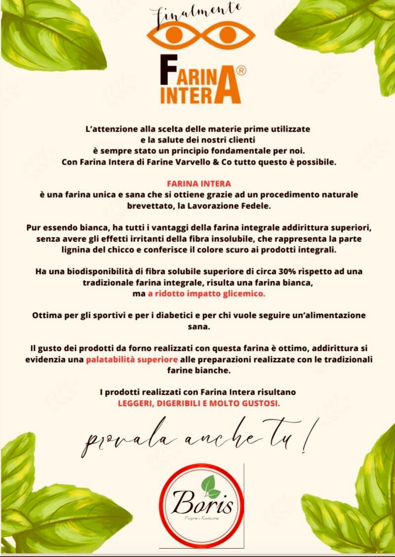 La Pizzeria Boris nasce dalla passione per la buona cucina e il desiderio di portare i sapori autentici tradizionali della cucina Mediterranea in ogni piatto. Con anni di esperienza nel settore, ci impegniamo ogni giorno a offrire ai nostri clienti un'esperienza gastronomica indimenticabile. Boris è una storia di famiglia, di tradizioni, di qualità, con un'attenzione particolare all'innovazione e d'impegno nella scelta di materie prime sempre di stagione per garantire un prodotto che parli sempre di autenticità territoriale. Per i nostri impasti abbiamo scelto le farine Varvello, a basso indice glicemico, con una lievitazione di circa 24/36 ore, per avere un prodotto buono, leggero e digeribile. Usiamo esclusivamente prodotti di qualità quali La mozzarella è di bufala DOP, il pomodoro San Marzano DOP, olio extravergine d'oliva italiano.Specializzati anche nella rosticceria quasi totalmente di nostra produzione. Possibilità di pizza senza glutine e di mozzarella senza lattosio. Ampio parcheggio gratuito adiacente. E' preferibile la prenotazione soprattutto nel week-end. Ci trovi anche su Instagram:boris_pizzeria e Facebook:Pizzeria Boris