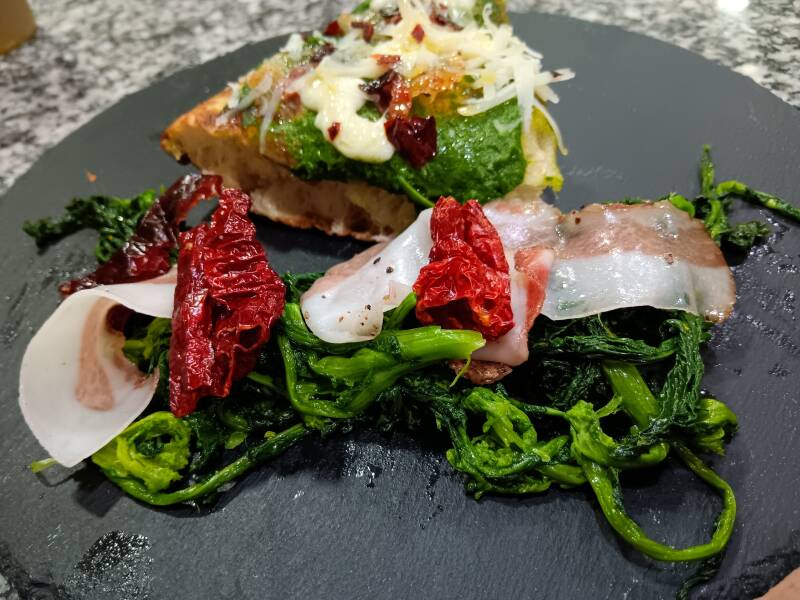 Broccoli saltati in padella, guanciale di maiale, mozzarella di bufala Dop, crema di broccoli, peperone crusco