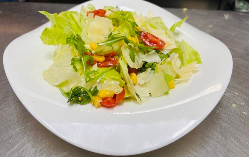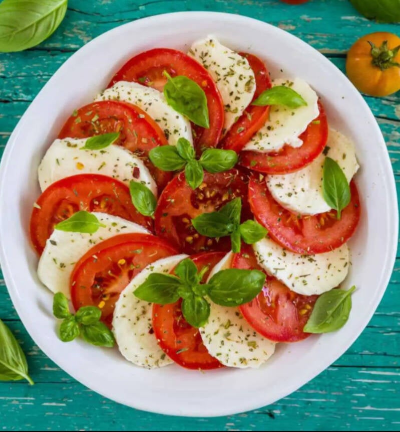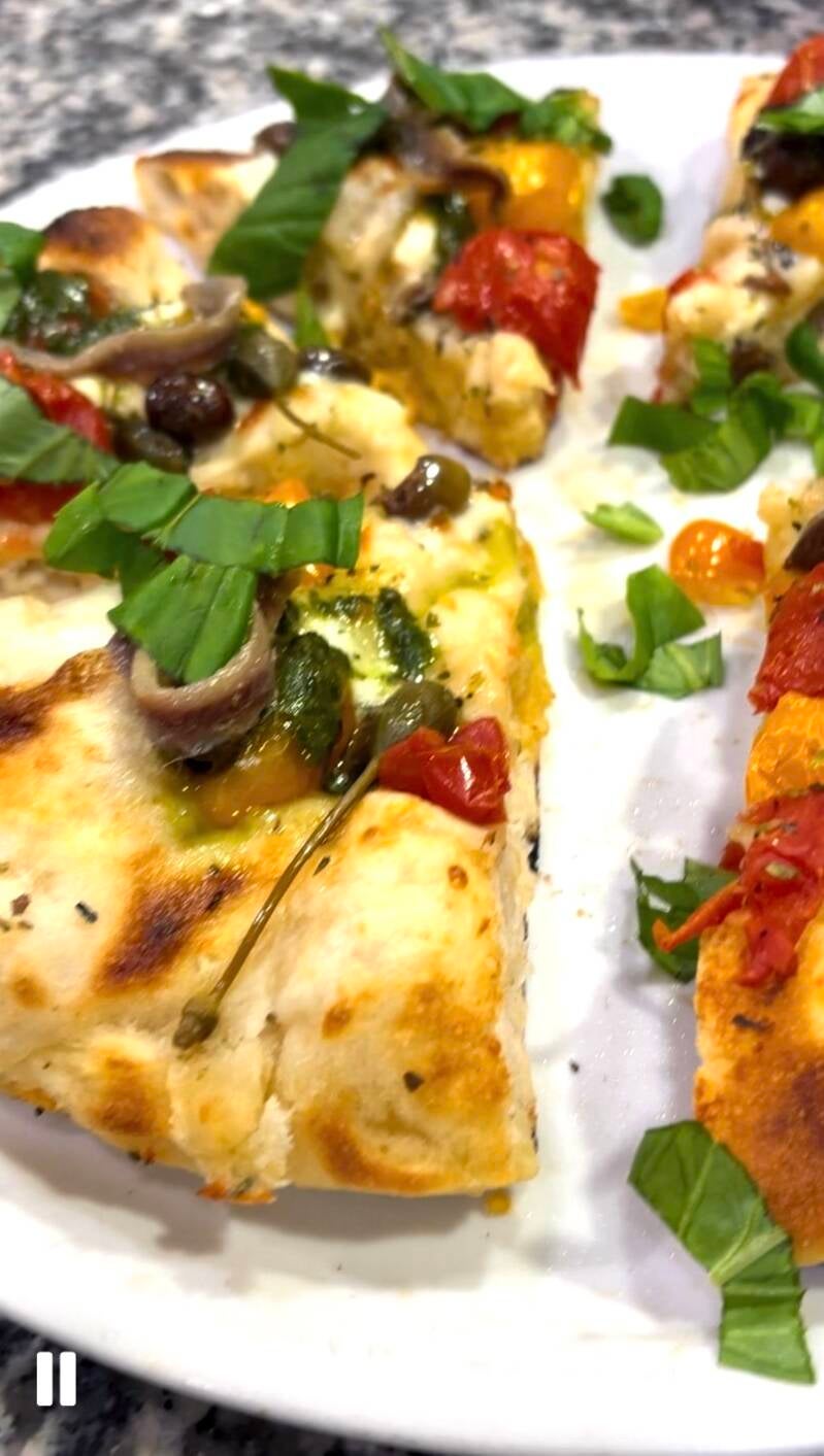 Mozzarella di bufala dop, datterino giallo e rosso, alici del Cilento, olive di Gaeta, frutto del cappero, olio all'aglio, peperoncino, origano e basilico.