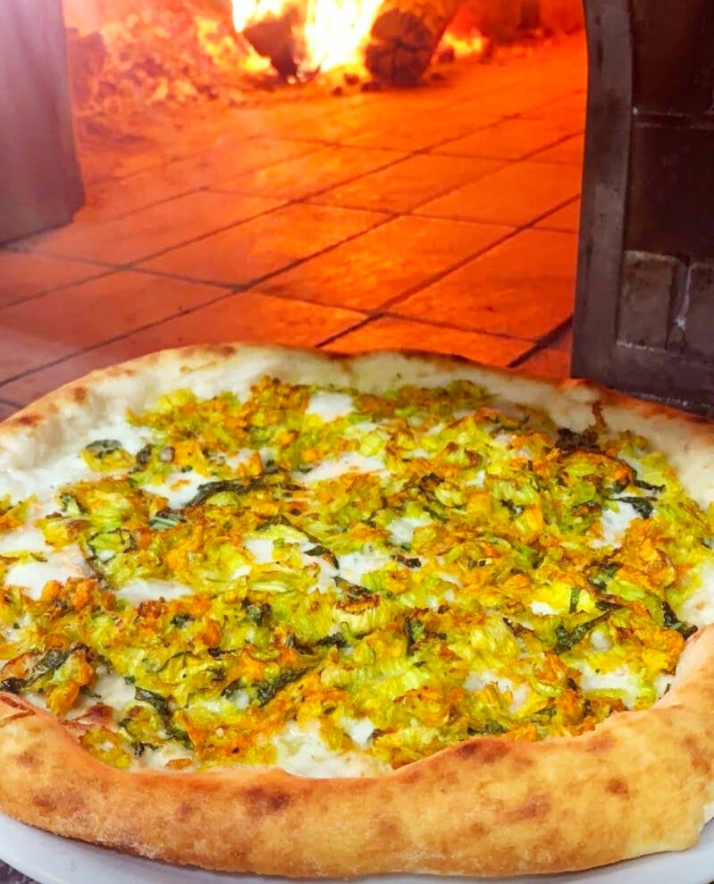 Fiori di zucca, mozzarella di bufala dop, origano, basilico, olio all'aglio, composto di capperi e alici, olio evo